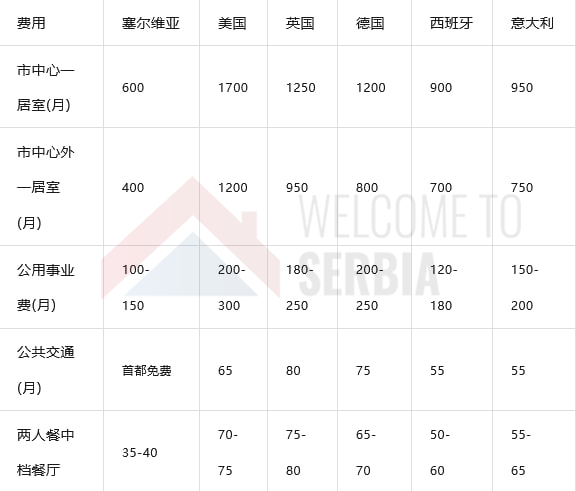 塞尔维亚的生活成本远低于西欧或美国,尤其是在住房、食品和交通方面。以下是平均月价格对比: